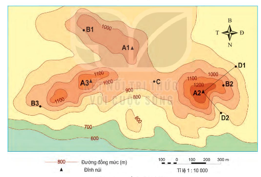 - Một bạn muốn leo lên đỉnh A2, ta nên đi theo sườn D1-A2 vì đường này dài hơn (các đường đồng mức cách xa nhau) chứng tỏ địa hình thoải. Với địa hình thoải thì việc leo núi sẽ dễ hơn.