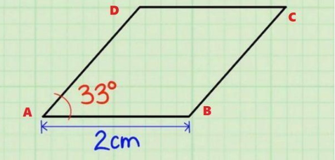 Ví dụ: Cho một hình thoi ABCD, có cạnh AB = 2 cm, 1 góc trong hình thoi có số đo là $33{}^\circ $. Hãy tính diện tích hình thoi ABCD.