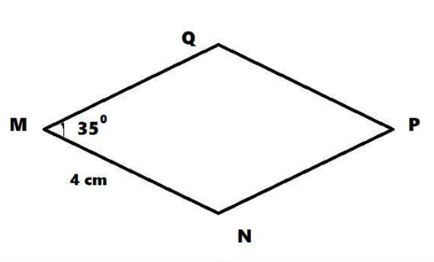 Bài 3: Cho một hình thoi MNPQ có cạnh MN bằng 4 cm và $\text{ }\widehat{QMN}\text{ }=\text{ }35{}^\circ $. Hãy tính diện tích hình thoi MNPQ.