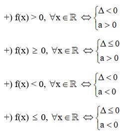 *) Các công thức về điều kiện để tam thức bậc hai không đổi dấu trên R.