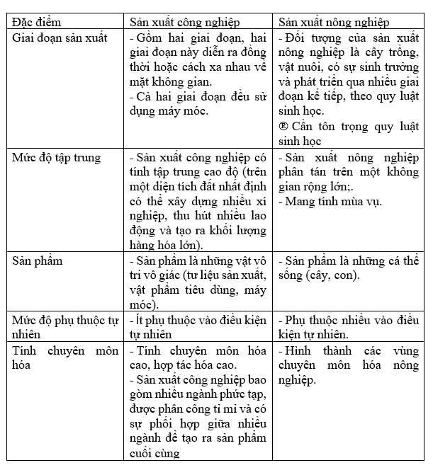 Em hãy cho biết sự khác biệt của sản xuất công nghiệp so với đặc điểm của sản xuất nông nghiệp về các tiêu chí: giai đoạn sản xuất, mức độ tập trung, sản phẩm, mức độ phụ thuộc vào tự nhiên và tính chu...