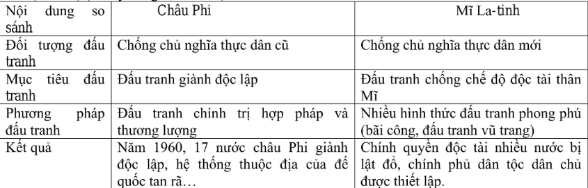 Em hãy hoàn thành bảng so sánh phong trào giải phóng dân tộc ở châu Phi và Mĩ La-tinh theo mẫu sau:<br><img src="https://minio.ftech.ai/fedu/62bea96fe859bb937f5bdf6c-20220713020822934.png" />