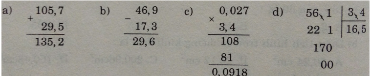 Đặt tính rồi tính:<br>a) <math xmlns="http://www.w3.org/1998/Math/MathML" display="inline"><mrow><mn>105</mn><mo>,</mo><mn>7</mn><mo>+</mo><mn>29</mn><mo>,</mo><mn>5</mn></mrow></math><br>b) <math xmlns="http://www.w3.org/1998/Math/MathML" display="inline"><mrow><mn>46</mn><mo>,</mo><mn>9</mn><mo>−</mo><mn>17</mn><mo>,</mo><mn>3</mn></mrow></math><br>c) <math xmlns="http://www.w3.org/1998/Math/MathML" display="inline"><mrow><mn>0</mn><mo>,</mo><mn>027</mn><mi>×</mi><mn>3</mn><mo>,</mo><mn>4</mn></mrow></math><br>d) <math xmlns="http://www.w3.org/1998/Math/MathML" display="inline"><mrow><mn>56</mn><mo>,</mo><mn>1</mn><mi>:</mi><mn>3</mn><mo>,</mo><mn>4</mn></mrow></math>