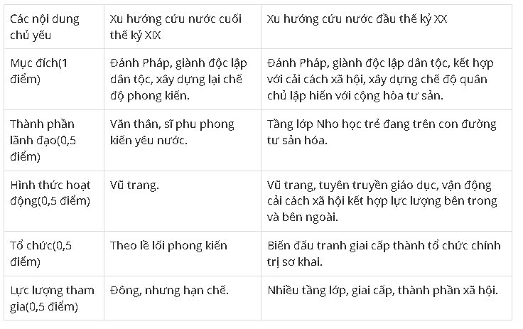 So sánh một số điểm cơ bản về xu hướng cứu nước cuối thế kỉ XIX và xu hướng cứu nước đầu thế kỉ XX theo các nội dung: mục đích, thành phần lãnh đạo, hình thức hoạt động, tổ chức, lực lượng tham gia. (3...