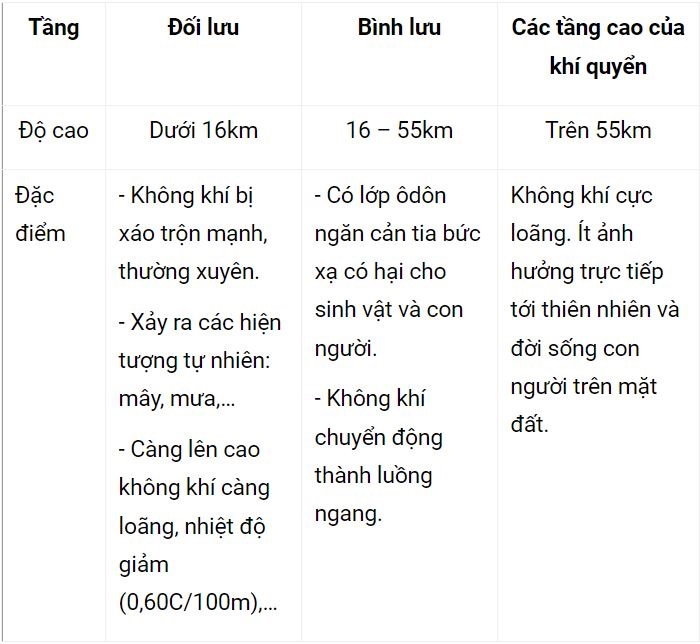 1. Khí quyển gồm 3 tầng: tầng đối lưu, tầng bình lưu, các tầng cao của khí quyển.