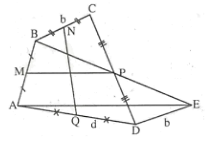 Từ (1) và (2), suy ra : MP + NQ $\leq \frac{\mathrm{a} +\mathrm{b} +\mathrm{c} +\mathrm{d}}{2}$.