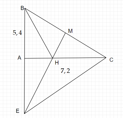 Có $\displaystyle \frac{EM}{AC} =\frac{MB}{AB} \ \Rightarrow EM=\frac{MB}{AB} .AC=\frac{4,5}{5,4} .7,2=6( cm)$