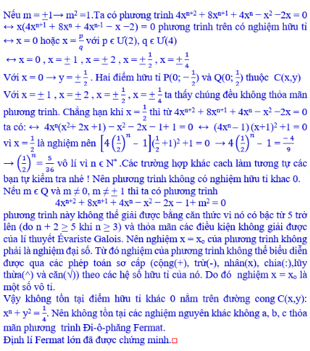 Vì đã suy ra mâu thuẫn trong cả hai trường hợp, giả sử ban đầu là sai. Do đó, định lí Fermat được chứng minh.