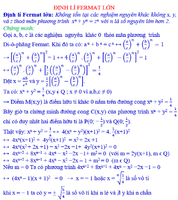 Định lí Fermat (hay còn gọi là Định lí Fermat nhỏ) được phát biểu như sau: "Không thể tìm được ba số nguyên dương a, b và c sao cho a^n + b^n = c^n với n lớn hơn 2."