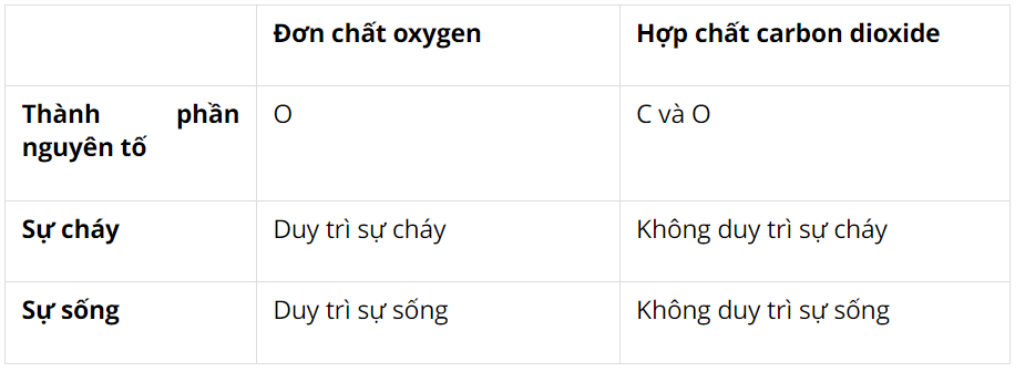 Đơn chất oxygen (O2) và hợp chất carbon dioxide (CO2) là hai chất khí quan trọng trong tự nhiên. Dưới đây là sự khác biệt giữa chúng về thành phần nguyên tố và vai trò đối với sự sống và sự cháy: