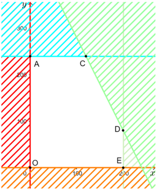 (A là giao điểm của trục tung và đường thẳng y = 240; C là giao điểm của đường thẳng y = 240 và 2x + y = 480, D là giao điểm của đường thẳng 2x + y = 480 và x = 200, E là giao điểm của trục hoành và đường thẳng x = 200).