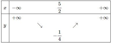 Có: $\displaystyle a=1 >0$⟹ Hàm số đồng biến trên $\displaystyle \left(\frac{5}{2} ;+\infty \right)$; nghịch biến trên $\displaystyle \left( -\infty ;\frac{5}{2}\right)$