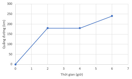 Từ đề bài ta có các tọa độ (t, s) như sau: (0, 0); (2, 180); (4, 180); (6, 240)