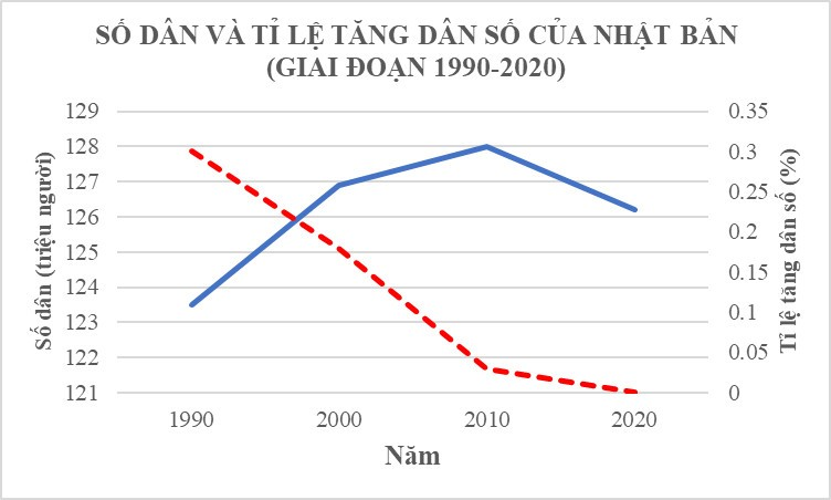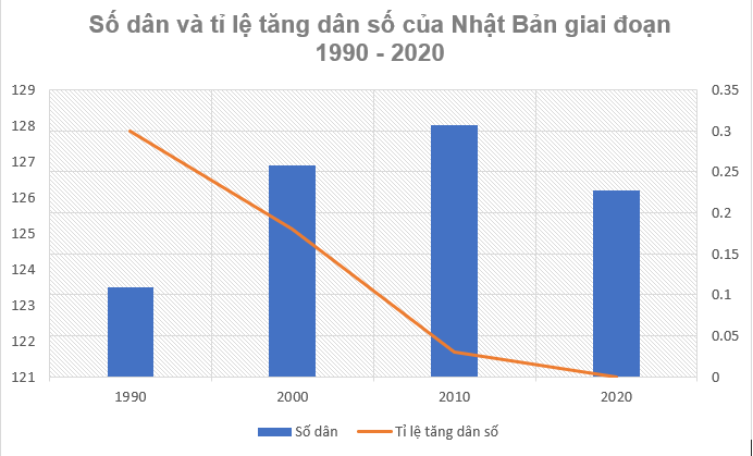 Biểu đồ thể hiện số dân và tỉ lệ tăng dân số của Nhật Bản giai đoạn 1990 - 2020