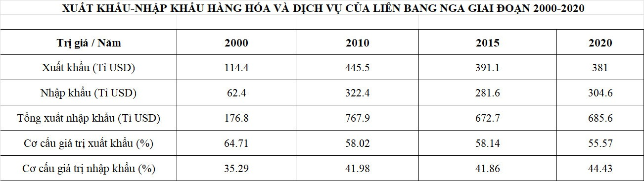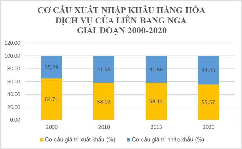 - Biểu đồ cơ cấu giá trị xuất nhập khẩu của Liên bang Nga giai đoạn 2000 - 2020: