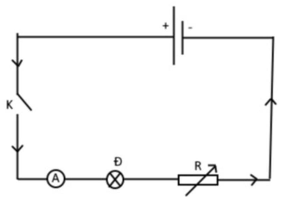 Để vẽ sơ đồ mạch điện gồm nguồn điện, khoá k, bóng đèn và ampe kế mắc nối tiếp với bóng đèn, biến trở mắc nối điện, chúng ta có thể vẽ như sau: