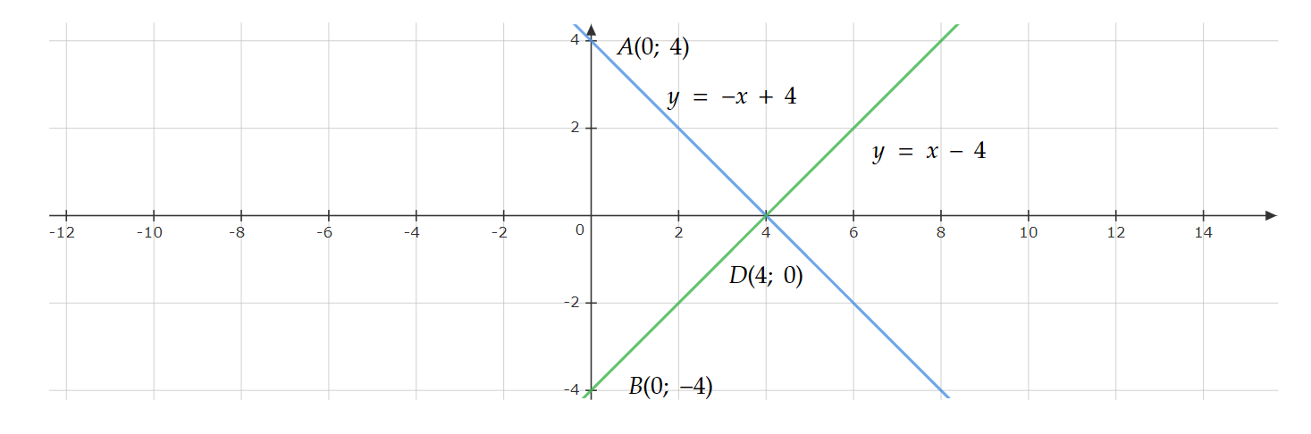 a) Đồ thị hàm số $\displaystyle y\ =\ -x\ +\ 4$ là đường thẳng đi qua D(4; 0), A(0; 4)