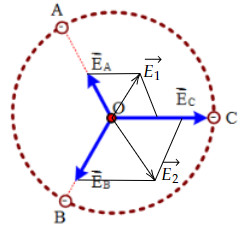 $\Rightarrow E=\sqrt{E_{1}^{2} +E_{2}^{2} +2.E_{1} .E_{2} .\cos 120^{0}} =\sqrt{E_{0}^{2} +4E_{0}^{2} +2.E_{0} .2E_{0} .\left( -\frac{1}{2}\right)} =E_{0}\sqrt{3}$