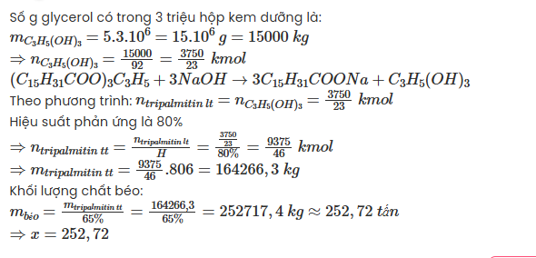 $m_{béo} =\frac{m_{tripalmitin\ tt}}{65\%} =\frac{164266,3}{65\%} =252717,4\ kg\approx 252,72\ tấn$