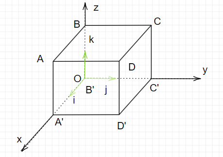 Như vậy, các vectơ ( \mathbf{i}, \mathbf{j}, \mathbf{k} ) đã được xác định và chúng tạo thành một hệ tọa độ Oxyz với gốc O tại B'.