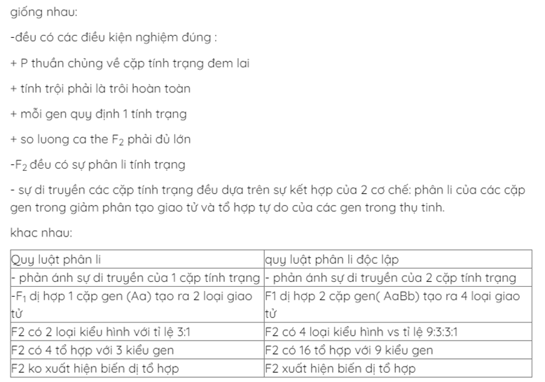 - Cơ chế của sự di truyền các tính trạng đều dựa trên sự phân li của các cặp gen trong giảm phân tạo giao tử và sự tổ hợp của các gen trong thụ tinh tạo hợp tử.
