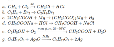 $e)\ C_2H_5OH+O_2\xrightarrow{men,\ t^o}CH_3COOH+H_2O$