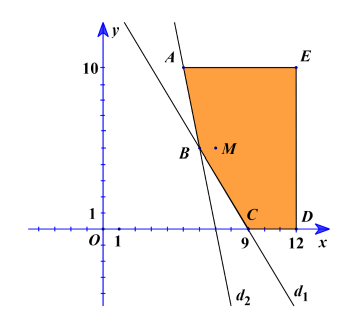 Suy ra miền nghiệm của hệ (*) là phần ngũ giác $A B C D E$, kể cả các đoạn thẳng $A B, B C, C D, D E, E A, v o ̛ ́ i ~ A(5 ; 10), B(6 ; 5)$, $C(9 ; 0), D(12 ; 0), E(12 ; 10)$.