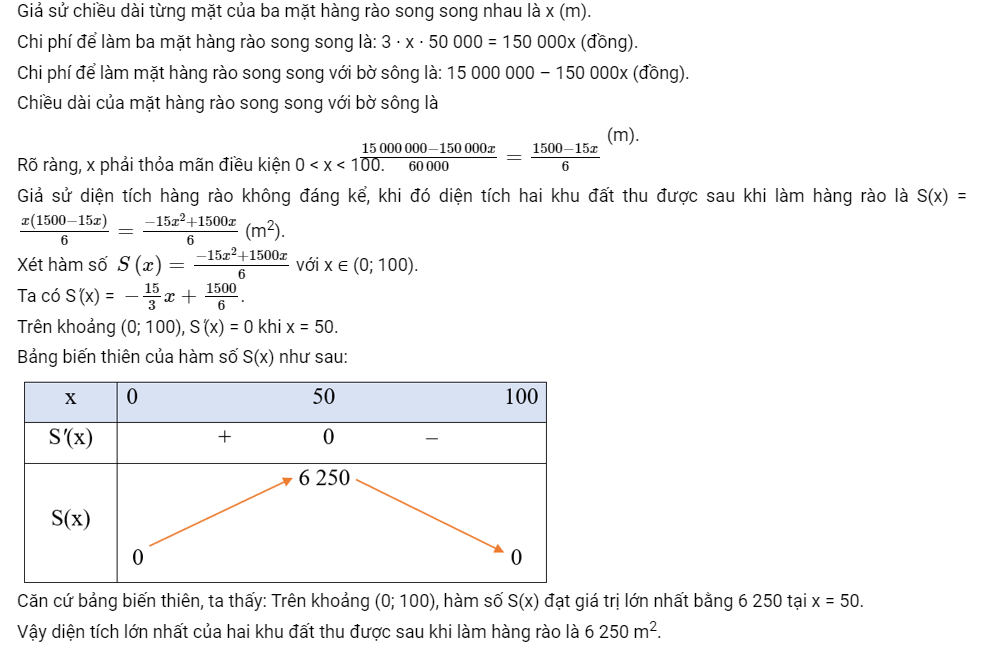 Một người nông dân có 15 000 000 đồng để làm một hàng rào hình chữ E dọc theo một con sông bao quanh hai khu đất trồng rau có dạng hai hình chữ nhật bằng nhau (Hình 35). Đối với mặt hàng rào song song với bờ sông thì chi phí nguyên vật liệu là 60 000 đồng/mét, còn đối với ba mặt hàng rào song song nhau thì chi phí nguyên vật liệu là 50 000 đồng/mét, mặt giáp với bờ sông không phải rào. Tìm diện tích lớn nhất của hai khu đất thu được sau khi làm hàng rào.