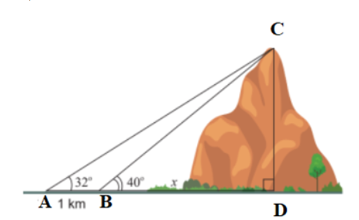 Suy ra: $\displaystyle x=\frac{\tan 32^{0}}{\mathrm{\ tan40^{0}} -\tan 32^{0}} \approx 2,92\ km$