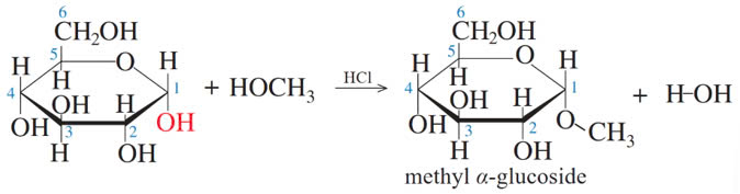 Phản ứng giữa glucose với methanol khi có hydrogen chloride làm xúc tác không xảy ra với glucose dạng mạch hở do glucose dạng mạch hở không có −OH hemiacetal