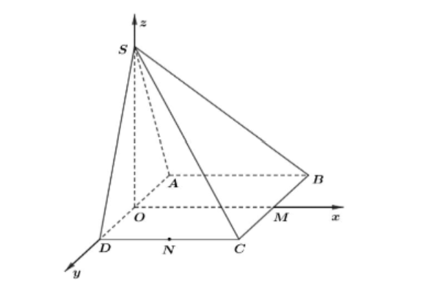 O(0, 0, 0), A(0, 0, 0), D(1, 0, 0), B(0, 1, 0), C(1, 1, 0), M$\left(\frac{1}{2}, 1, 0\right)$, N$\left(1, \frac{1}{2}, 0\right)$, S(0, 0, 1).