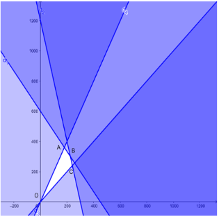 Biểu diễn miền nghiệm của hệ bất phương trình là tứ giác OABC với O(0; 0), A(180; 360), B(200; 250), C(240; 240).