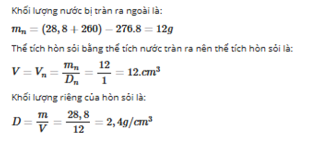 - Vì khối lượng riêng của nước là 1g/cm³, nên thể tích nước tràn ra cũng chính là thể tích của viên sỏi và bằng 16,8 cm³.