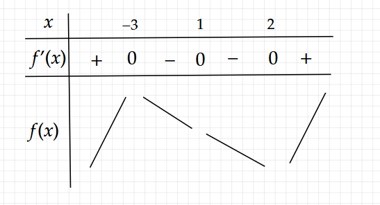 Chúng ta sẽ xét dấu của \( f'(x) \) trong các khoảng: \( (-\infty, -3) \), \( (-3, 1) \), \( (1, 2) \), và \( (2, +\infty) \).