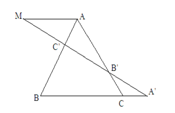 Cho tam giác ABC . Các điểm $\mathrm{A}^{\prime}, \mathrm{B}^{\prime}, \mathrm{C}$ ' lần lượt nằm trên các đường thẳng $\mathrm{BC}, \mathrm{CA}, \mathrm{AB}$ sao cho trong chúng hoặc không có điểm nào, hoặc có đúng 2 điểm thuộc các cạnh của tam giác ABC . Khi đó $\mathrm{A}^{\prime}, \mathrm{B}^{\prime}, \mathrm{C}$ ' thẳng hàng khi và chỉ khi $\frac{\mathrm{A}^{\prime} \mathrm{B}}{A^{\prime} C} \cdot \frac{B^{\prime} C}{B^{\prime} A} \cdot \frac{C^{\prime} A}{C^{\prime} B}=1$