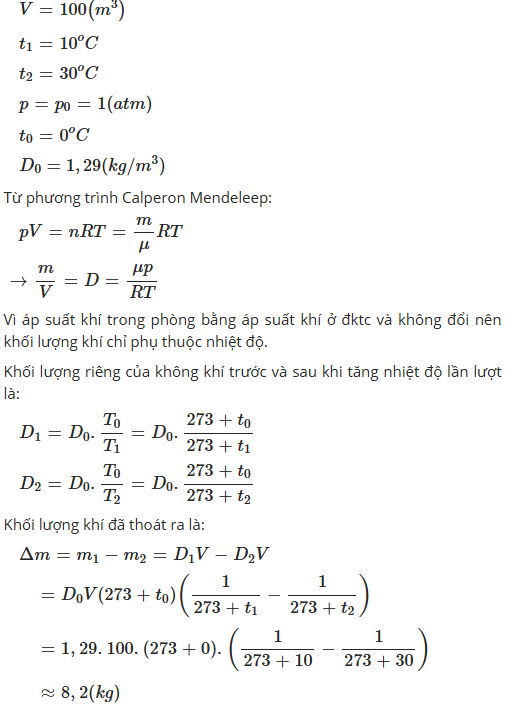 - Áp dụng phương trình trạng thái của khí lý tưởng:Vì áp suất không đổi (P₁ = P₂) và thể tích phòng không đổi (V₁ = V₂ = V), nên ta có:=> Khối lượng không khí ban đầu không đổi.