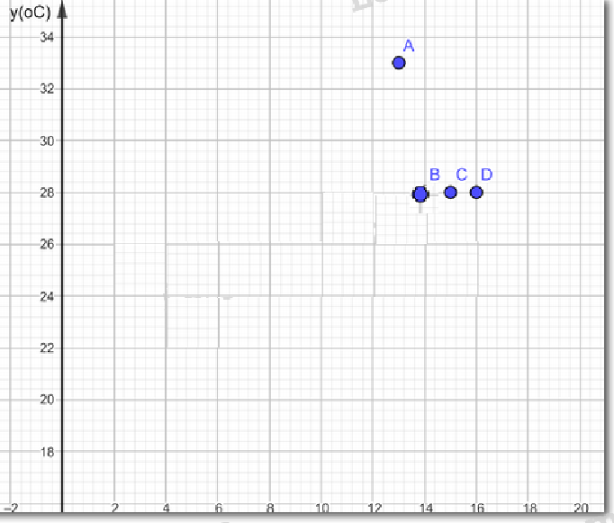 c) Quan sát mặt phẳng tọa độ Oxy, tọa độ các điểm A(13, 33); B(14, 28), C(15, 28), D(16, 28) thuộc đồ thị hàm số đã cho ở bảng 1