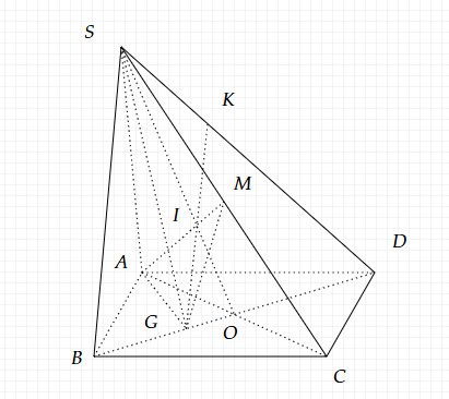 Từ (1)(2)$\displaystyle \Rightarrow \frac{IO}{SO} =\frac{OG}{OB} \Rightarrow IG//SB$ (định lý Thales đảo)