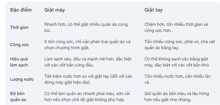 Sử dụng máy giặt giúp tiết kiệm thời gian và công sức hơn so với giặt tay, đồng thời mang lại hiệu quả giặt sạch hơn. Tuy nhiên, giặt tay có thể cho phép bạn kiểm soát tốt hơn đối với những món đồ nhạy cảm hoặc cần chăm sóc đặc biệt.