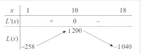 Đạo hàm $L^{\prime}(x)=-3 x^2+6 x+240 ; L^{\prime}(x)=0 \Leftrightarrow x=10$ hoặc $x=-8$ (loại).