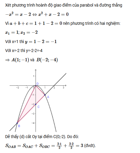 Giao điểm của parabol và đường thẳng cùng với gốc tọa độ tạo thành tam giác có đỉnh ở \( (0, 0) \), \( (2, 4) \), và \( (-1, 1) \).