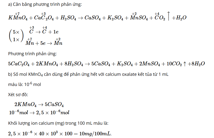Để tính nồng độ Ca²⁺ trong máu, ta cần xác định lượng CaC₂O₄ đã phản ứng với dung dịch KMnO₄.