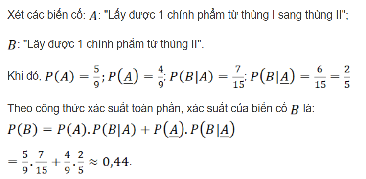 P(\text{chính phẩm từ thùng II}) = P(\text{chính phẩm từ thùng I}) \times P(\text{chính phẩm từ thùng II} | \text{chính phẩm từ thùng I}) + P(\text{phế phẩm từ thùng I}) \times P(\text{chính phẩm từ thùng II} | \text{phế phẩm từ thùng I})