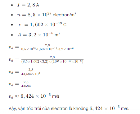 **Kết quả: Vận tốc trôi của electron là \( 6,43 \times 10^{-5} \) m/s.**