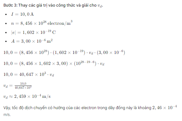 Để tìm tốc độ dịch chuyển có hướng của các electron trong dây dẫn đồng, chúng ta có thể sử dụng công thức sau: