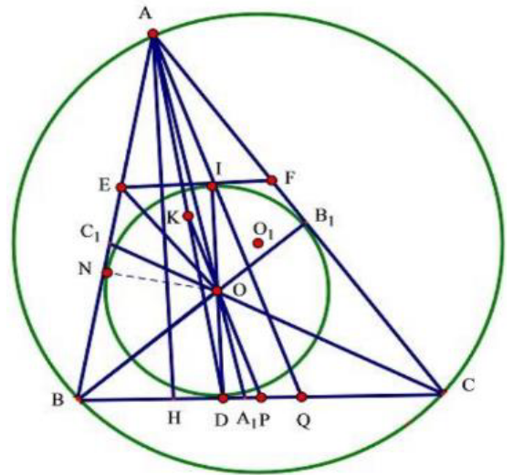 Mà $E N=E I, B N=B D$ (tính chất hai tiếp tuyến cắt nhau)
