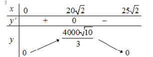 Xét hàm số $y=\frac{1}{3} \cdot \sqrt{1250 x^4-25 \sqrt{2} x^5}$ với $0<x<25 \sqrt{2}$.