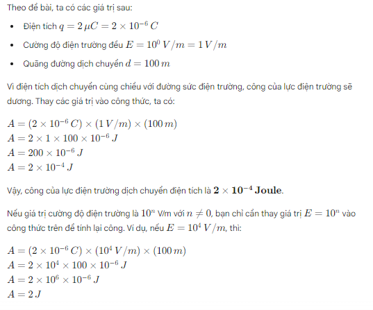 Vậy công của lực điện trường dịch chuyển điện tích \( 2 \mu C \) là \( 0.0002 \, J \).