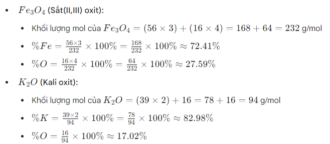 4. **K₃PO₄**: Tính phần trăm K, P, O.
