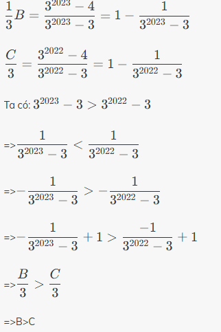 Cho B = 3^(2023−4) / 3^(2022−1) = 3^2019 / 3^2021 = 3^(-2)